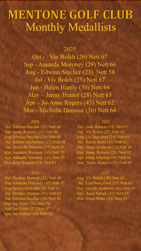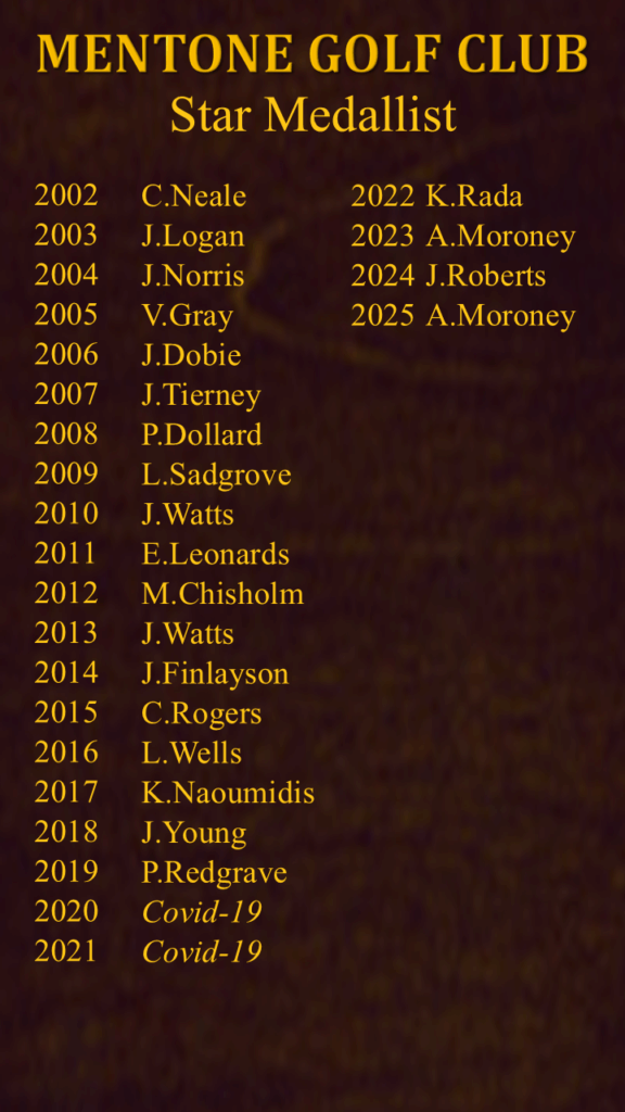 Mentone Golf Club has produced five VWGL Champion of Champions; won the VWGL “A” Grade Pennant flag in 1984 and the “D” Grade Pennant flag in 2001.