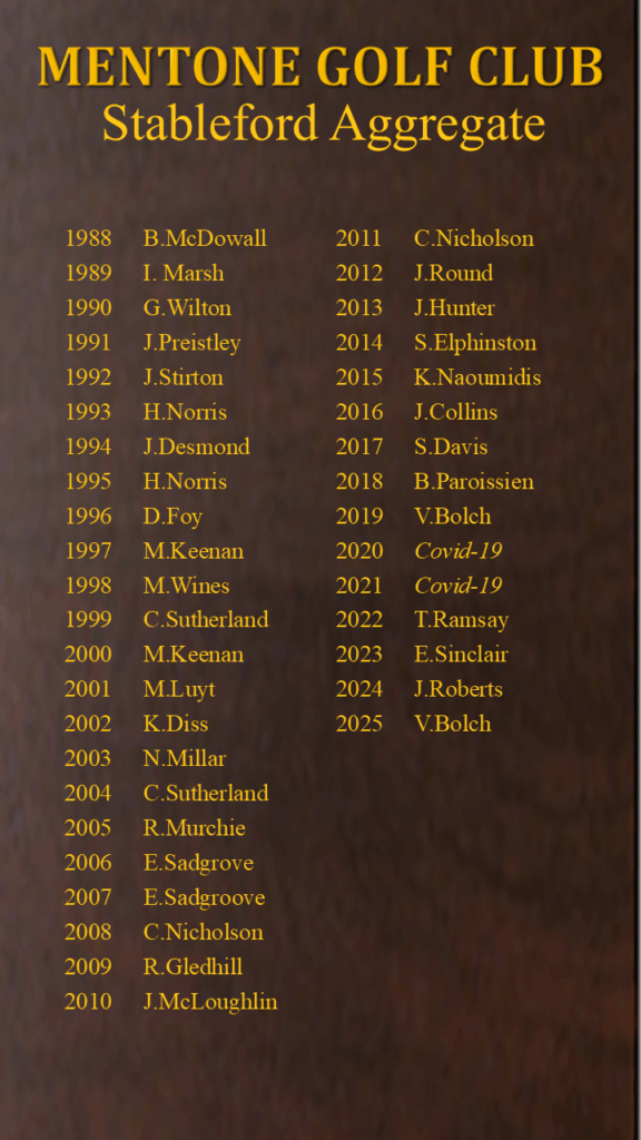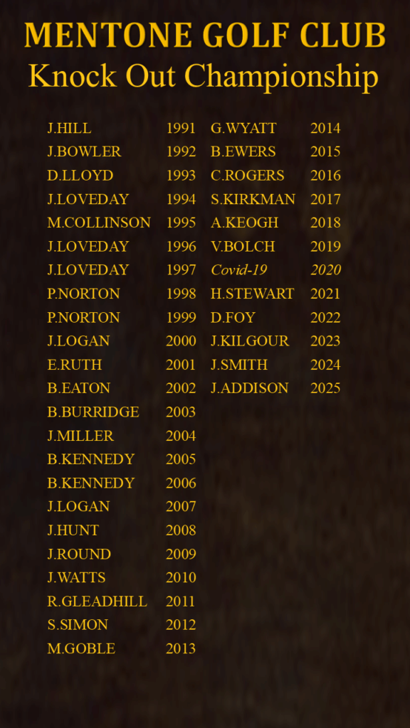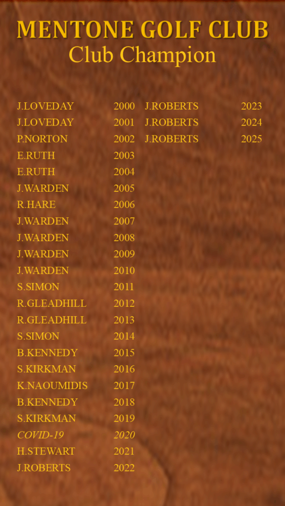 Mentone Golf Club has produced five VWGL Champion of Champions; won the VWGL “A” Grade Pennant flag in 1984 and the “D” Grade Pennant flag in 2001.
